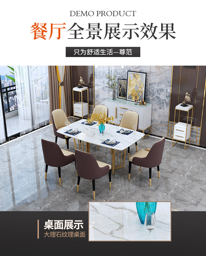 尊範テーブル軽奢大理石テーブル家庭用テーブルmodaシンプロ港式レストランセット長餐台1.6 m+食事椅子*6+サイドキャビネット+高花架*2個