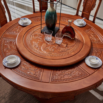 カラー雲は新中国式の彫刻花に戻ります。純木ゴムのテーブルを明るくします。古典的な大きな丸いテーブルと椅子を回転させます。6-16人の家庭用食事テーブルです。1.6 Mテーブル+象頭椅子*10