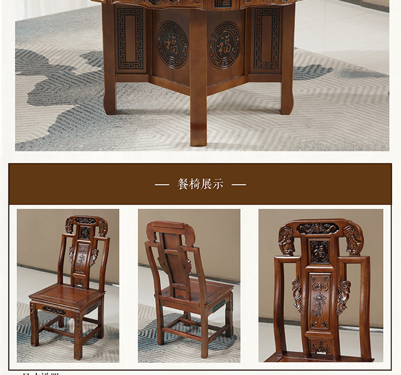 博曼全純木の食卓は古式の食事のテーブルと椅子を組み合わせて、新しい中国式のテーブルに彫刻します。回転台の大きい円卓の新しい古典ホテルの円形の食卓のホテルのテーブルの胡桃色の1.3メートルのテーブルに6つの椅子があります。
