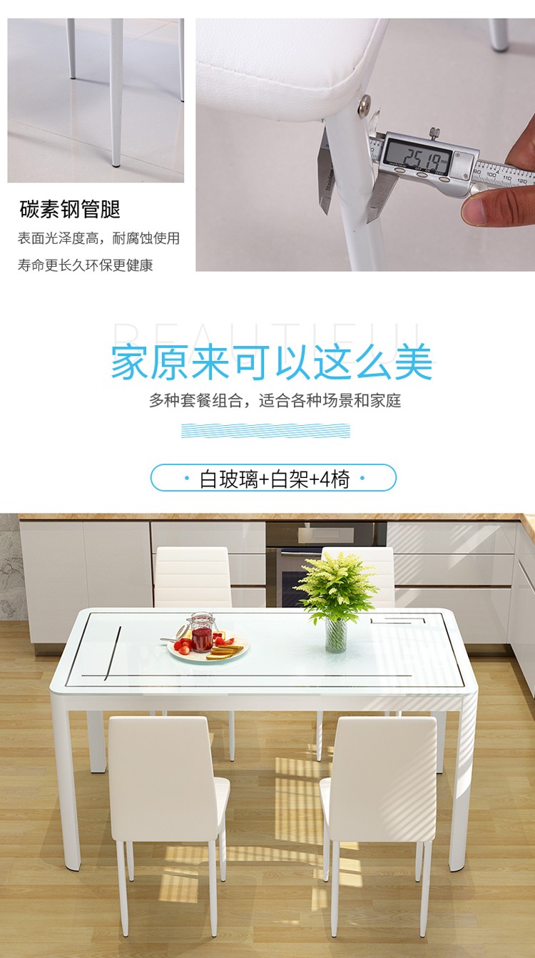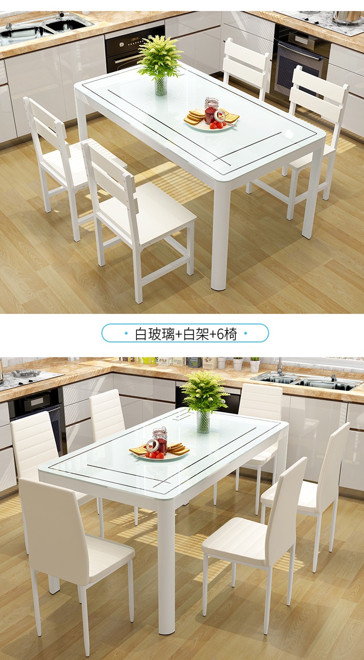 ドロニョの食卓のテーブルと椅子の組み合わせモダシンプ4人6人の長方形家庭用食事テーブルの鋼化ガラステーブルの全白+4つの軟座の組み合わせの長さは120、幅70、高さ75です。