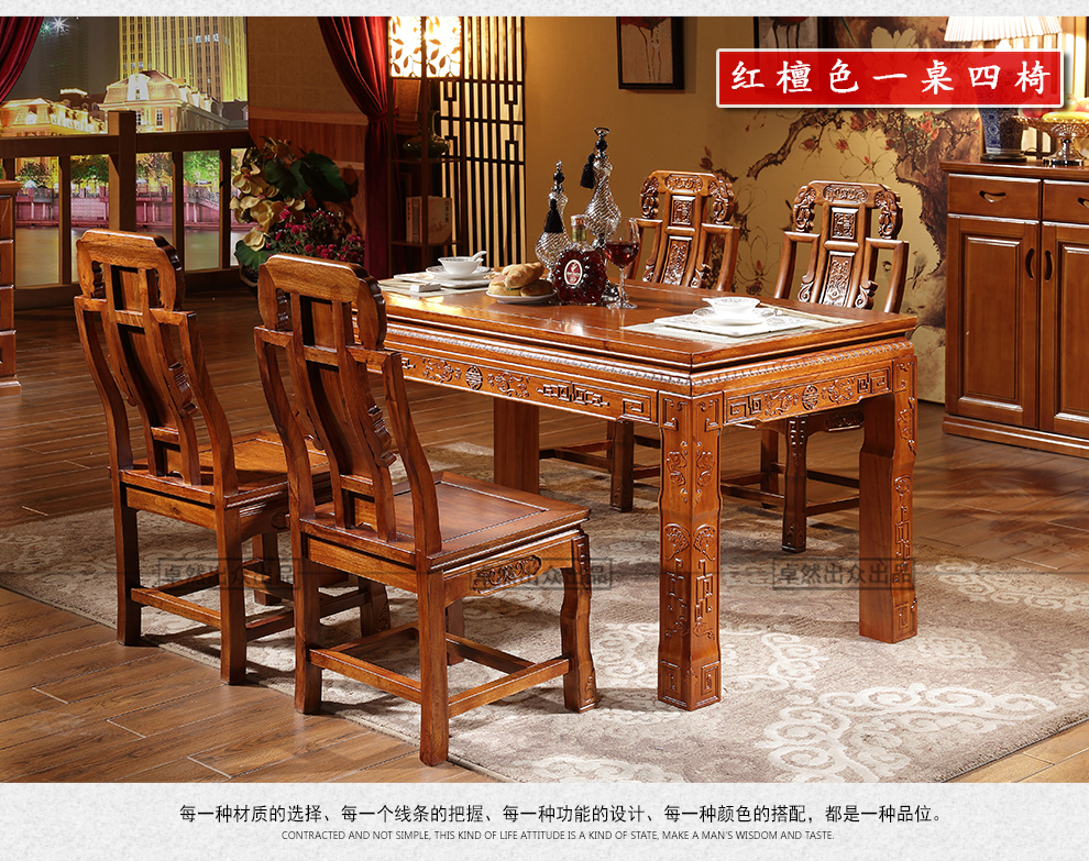 卓然として優れた純木食テーブルと椅子、新中国式の古長方形テーブルテーブルの彫刻テーブルと椅子、香樟木食テーブルとテーブルの組み合わせ302赤檀色のテーブル六椅子(1.38 M)
