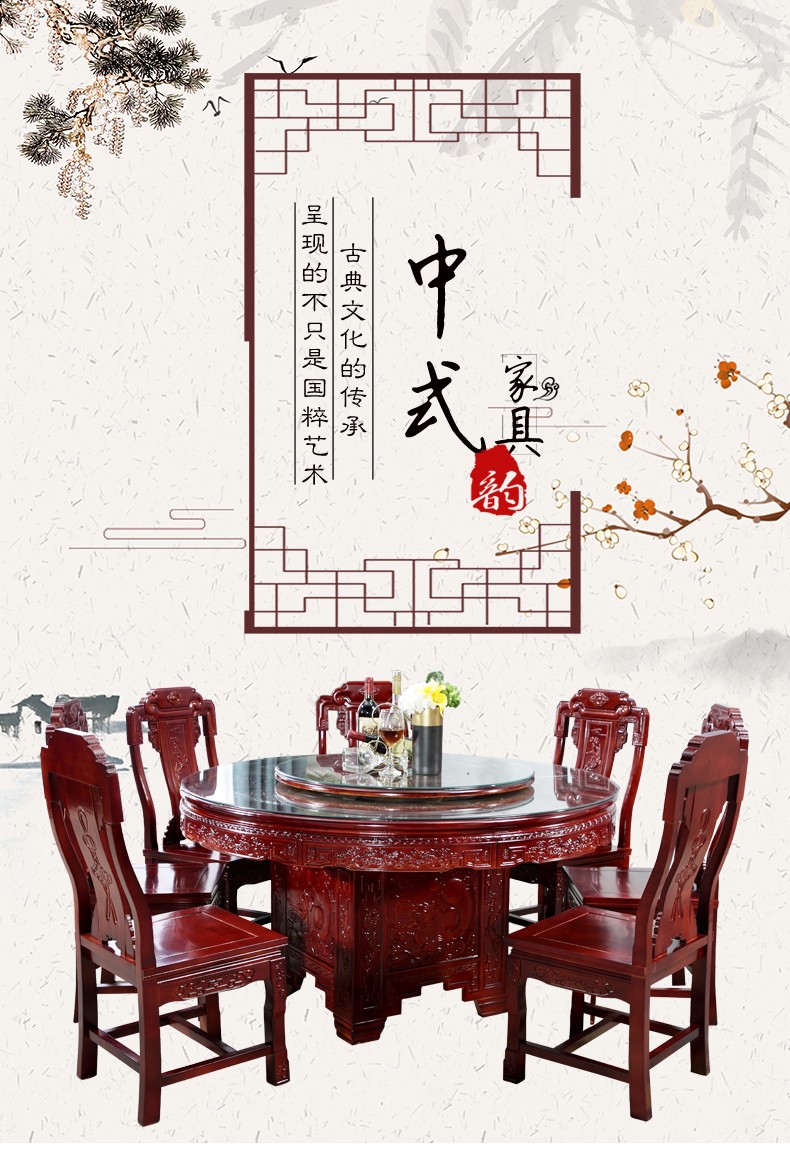 多子(dZ)純木テーブルの円形の中国式彫刻テーブルと椅子の組み合わせ家庭用ベルト回転テーブル付き円卓ホテル純木台のテーブル+象頭椅子の8つの1.5メートル(注文メモの色)